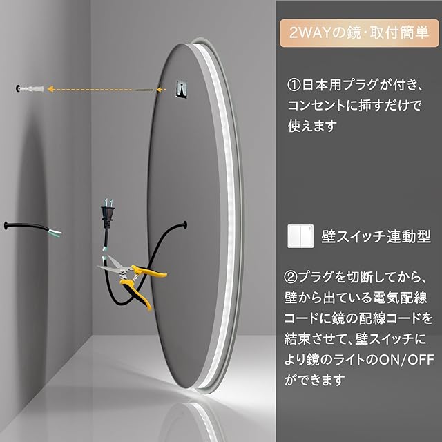 【前後2箇所発光でもっと明るい!】鏡の裏に2本のLEDテープライトが設置しており、前も後ろも発光するので、従来品より明るさが2倍にパワーアップ!高輝度のLEDライトで、十分の明るさを提供します、お顔を明るく照らし、影を作らず細部までチェックが可能です。LED電球の寿命は50000時間、消費電力が約85%少なく、電気代も節約できます