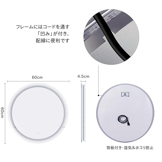 Wisfor 洗面所 鏡 丸型 ミラー LED 照明 浴室鏡 曇らない 無段階調光 3色調整 お風呂鏡 洗面台 壁掛け鏡 化粧鏡 新築 ホテル おしゃれ 60×60㎝