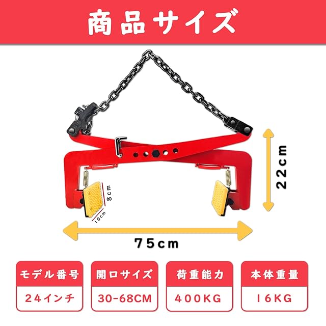 商品仕様:最大積載量400kg、開口幅30~51cm、本体重量11kg、本体素材は合金鋼材