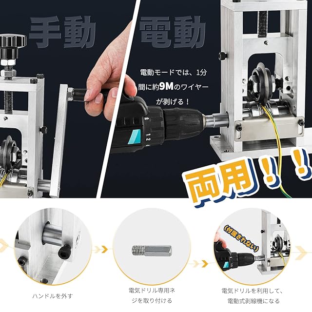 「豊富なカスタマイズ機能」テーブルに穴を開けて、機械をテーブルに固定でき、高い安定性を持っております。必要に応じてハンドルを電気ドリル(別途購入)に交換したり、モーター(別売り)を組み立てたりして、より効率的な自動ワイヤーストリッパーを実現することもできます。