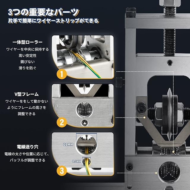 「幅広い使用範囲」2-30mmワイヤーに対応。つまみでブレードの高さを調整でき、どんな電線皮むき加工でも簡単に仕上がります。極めて鋭いブレードにより、より線等も丁寧にストリッピング(皮むき)することができ、あらゆる被覆ケーブルに適用します。銅線のリサイクル、電線皮剥き作業などに使用されます。※銅線の範囲は2.5cm以内を推奨です、2.5cm以上の銅線に使用する場合は、フロントベゼルを取り外すことができます。