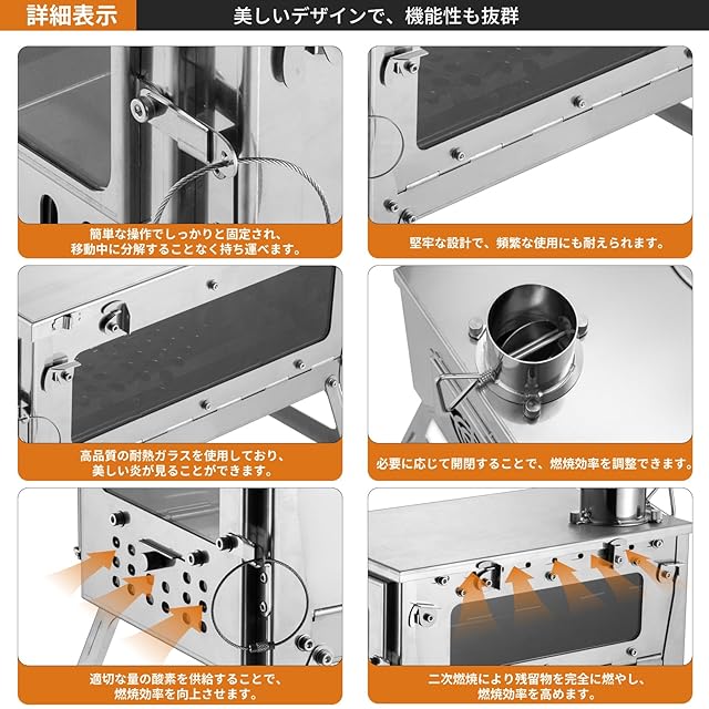 【圧倒的な燃焼効率の高さ】こちらのウッドストーブは少ない燃料で高火力、煙や灰が少ない二次燃焼構造を採用しています。ウッドストーブの二次燃焼により、大きな火力になるだけでなく、また、ウッドストーブには灰受けがあるため、薪が完全燃焼しやすく、灰が残りにくいです。キャンプストーブの片付けの手間を減らしてくれます。