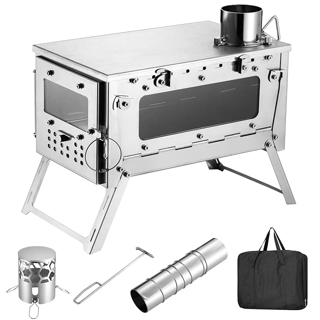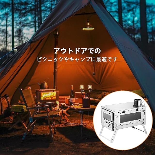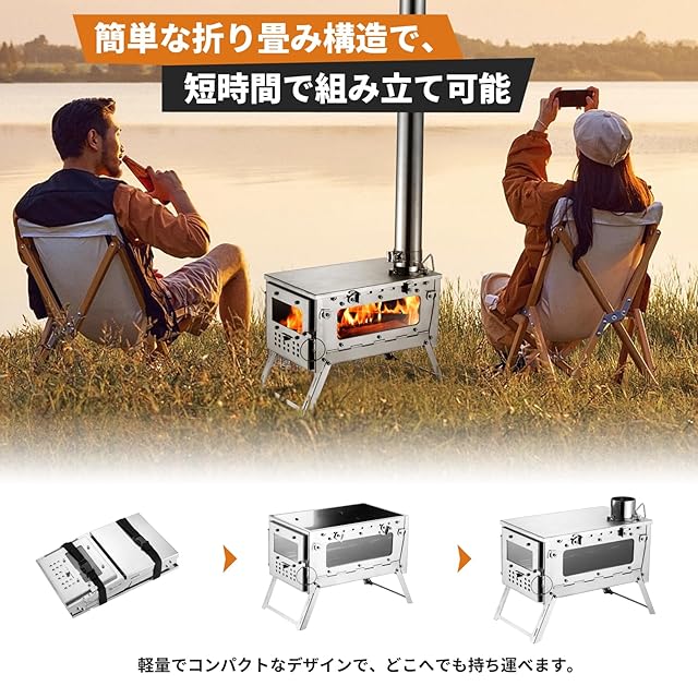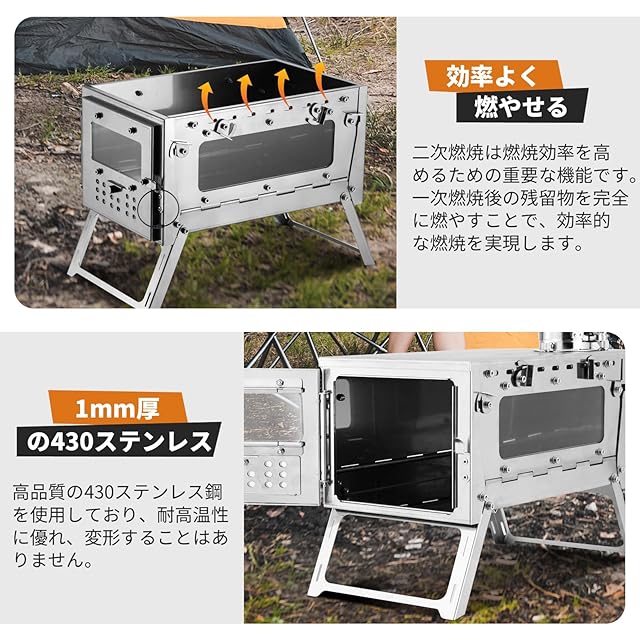 SENQI 薪ストーブ 二次燃焼 キャンプ用 焚き火ストーブ 2面ガラス窓 煙突 ストーブ キャンプ 調理器具 クッキングストーブ 折りたたみストーブ 灰受け付き 携帯便利 暖炉煙突付きテント調理