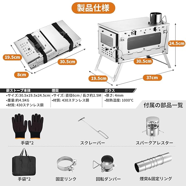 【薪ストーブ・製品仕様】展開サイズ:約L37cm×W19.5cm×H24.5cm (煙突300cm); 収納サイズ:約L30.5cm×W19.5cm×H8cm;材質:本体・煙突:ステンレス鋼;本体重量:約4.5kg。