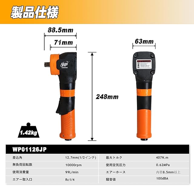 【仕様】本体サイズ:L248×H71mm(ソケット含まず) 重量:1.42kg・差込角 : 12.7mm(1/2")・最大トルク407N.m・無負荷回転数:7500min-1・使用空気圧力:0.62MPa・使用消費量:99L/min・空気取入口:RC1/4·騒音値:100dB