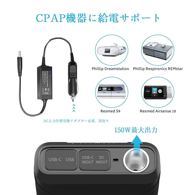 【CPAP機器対応ポータブル電源】高性能DC12V / 5A(最大150W)車用電源ソケットを搭載しているため、市場に出回っているのほとんどのCPAP機器に対応することが可能となります。CPAP機器の使用際に、長時間の使用のためにCPAP機器の加熱と加湿機能をオフにしてください。