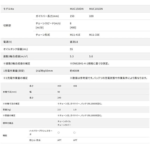 ガイドバー長さ150mm、チェーンスピード8m/s[480m/分]