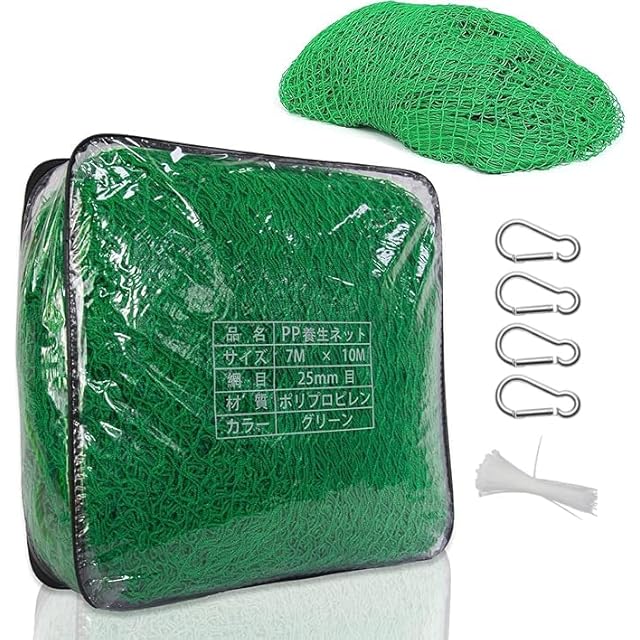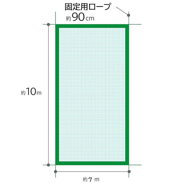 【商品仕様】:サイズ: 幅約7m×奥行10m 網目サイズ: 約2.5×2.5cm 紐の長さ: 約90cm カラー: グリーン 内容: 1枚 材質: ポリプロピレン