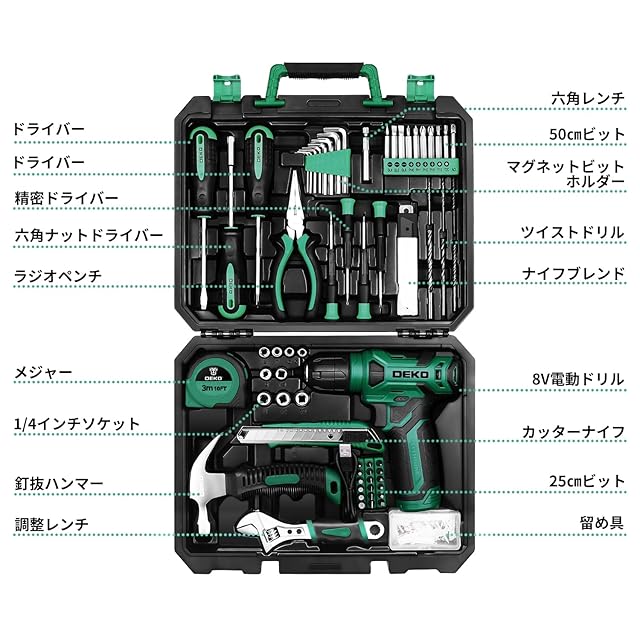 【8V電動ドリル付き】 工具セット 126点組 ピンク ホームツールセット 家庭用 ツールセット 日曜大工 DIYセット 作業工具セット 家具の組み立て 住まいのメンテナンス用 修理道具セット 便利な収納ケース付き (グリーン)