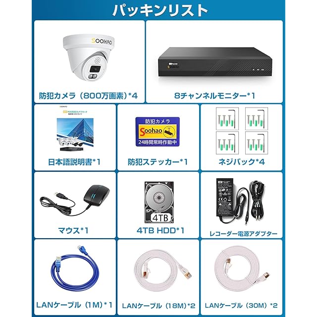 【4K800万画素・人体・車両検知・双方向音声】SOOHAO 防犯カメラ poe有線 2160P 800万画素 監視カメラ 4台セット4TB HDD 8チャンネルまで増設可 常时録画 録音 夜間カラー AI人体検出 遠隔監視 防水ip66 落雷保護 セキュリティ 防犯カメラ 屋内/屋外 室外 家庭用 業務用 簡単 2年保証 電話サポート(800万画素POE 4台4TB)