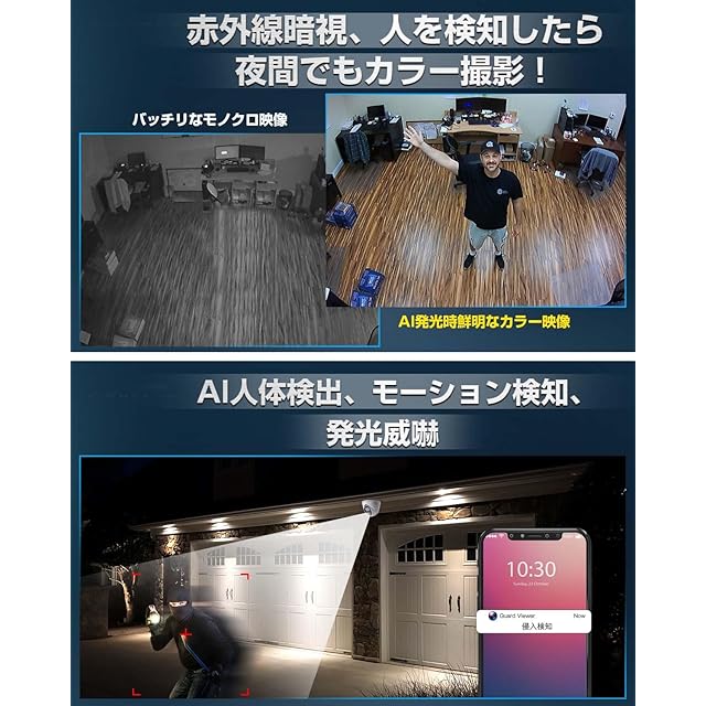 【AI人体/車両検出・発光威嚇・上書き機能】SOOHAO 監視カメラはAI人検知だけでなく、車両検知、発光威嚇機能、動きを検知するとスマートフォンへ通知する機能を搭載しております。通知機能を利用すれば外出中でも、いつでも異変に気付くことが出来るので安心です。上書き機能に上質HDD 4TBが内蔵されて、2台常時録画で10日以上録画可能となります。ハードディスク残量が不足の際、システムは自動的に古い映像データを削除し録画し続けます。
