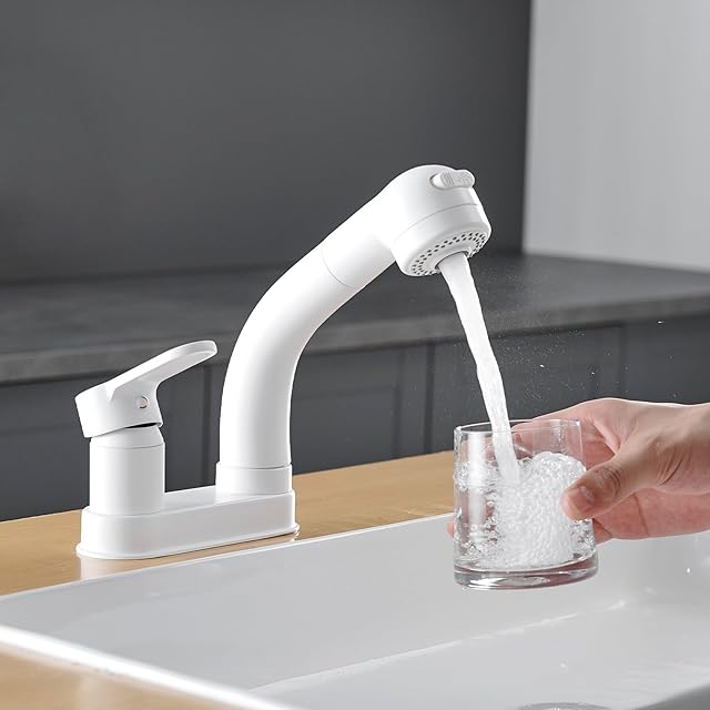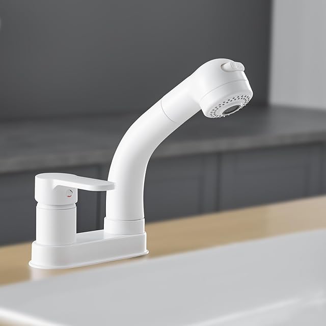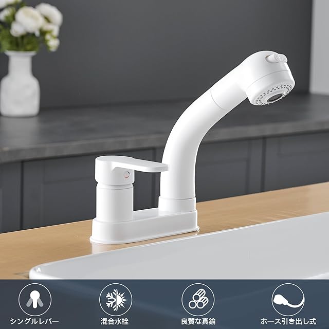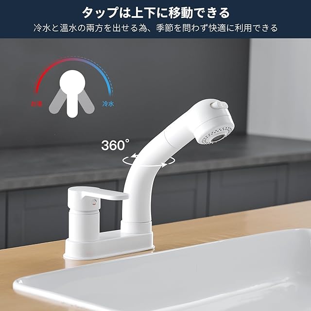 高品質:水栓の表面はホワイトの焼付塗装工芸、清潔感いっぱい!ノズル部分はABS樹脂、中身は良質な真鍮、耐腐食性と耐久性がアップ!