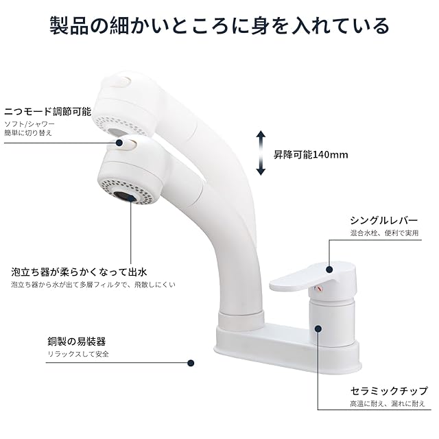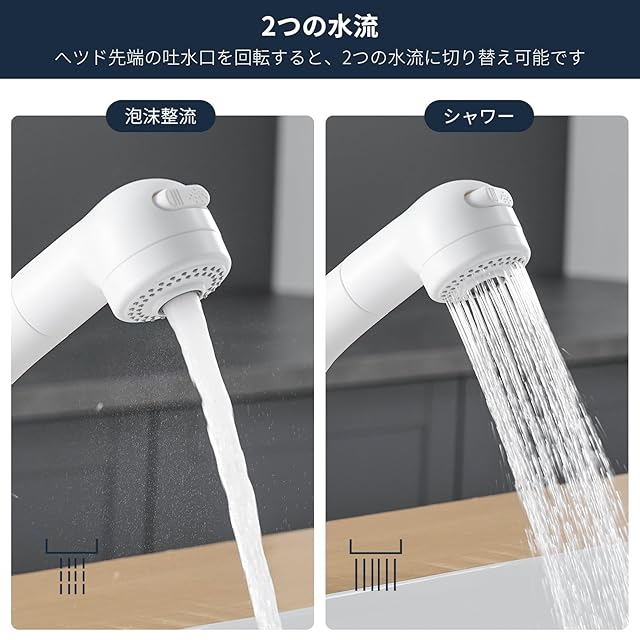 泡沫整流、シャワー切り替え:泡まつノードに切り替え、水流音を弱めることだけではなく、節水効果もある。さらに水はねがなく、シンクの周りに飛び散ることを防止できる。