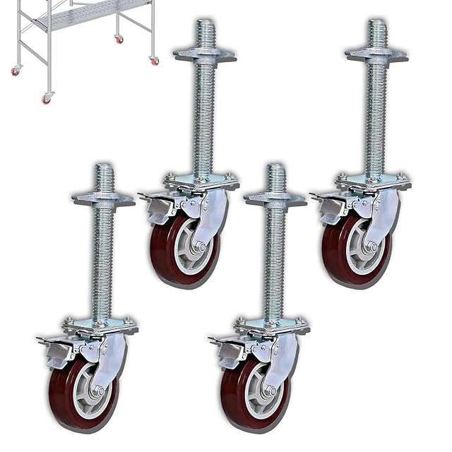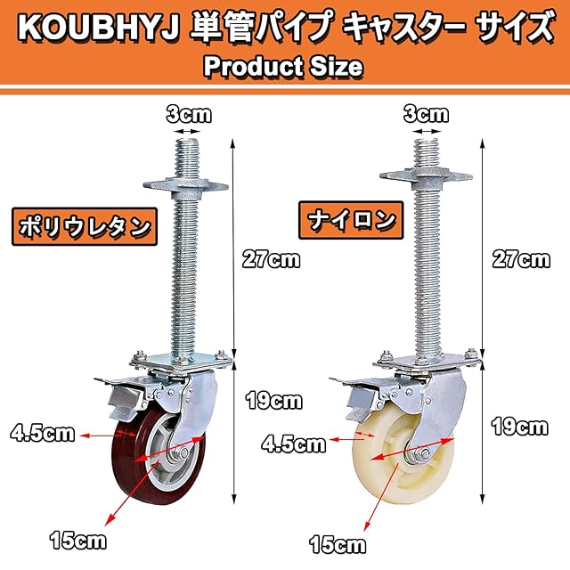 Koubhyj 単管パイプ キャスター【ブランド直販 4個 キャスター ねじ付きステム付き】, ローリング足場 キャスター 簡単設置 DIY 産業用キャスター 46cm 耐摩耗 移動キャスター 耐荷重約800KG, ブレーキセーフロックスイベルキャスター 重量用キャスター 単管 キャスター 後付け 台車や家具に適用 ゴム車輪 店舗 工場 倉庫 作業 運搬(ポリウレタンホイールx4)