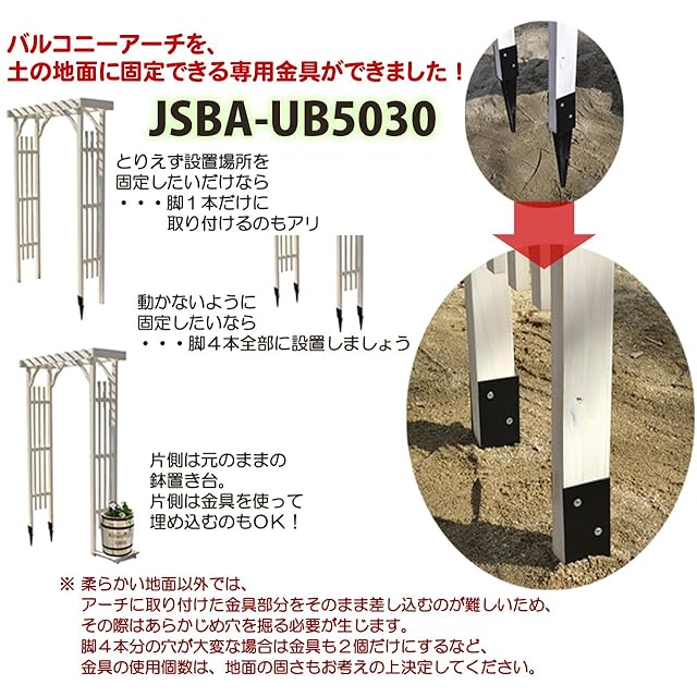 バルコニー・ベランダやお庭のちょっとしたスペースでも使えるガーデンアーチ(パーゴラ)です。関連商品として、シェッドファサードウォール(SFW-1100DBR)や土の地面に固定するための埋め込み金具(JSBA-UB5030)もございます。
