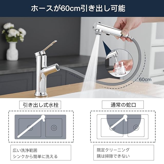 ホース引き出し式:洗面水栓のホースは最長60cm引き出し可能です,洗髪、洗面台をお掃除、場合はにはとても便利です。洗髪することも楽々で、蛇口に手が届かないお子様も最適です。