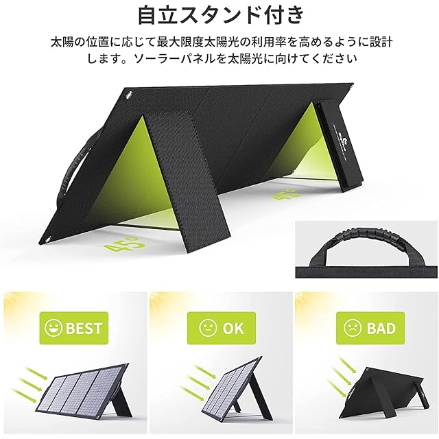 ✅【 スマート IC&高変換効率 】:80W ソーラーパネルはBigBlue 独自技術Smart-ICテクノロジーが内蔵され、逆流電や過熱、過電流、過充電などを防ぎ、接続したデバイスを自動的に検知して最適な電流で急速充電を行うことができます。23%の高変換効率を実現できる単結晶シリコン型高効率ソーラーパネルを4枚搭載して、電力出力は最大80w、全く電源が無い状態でも、太陽光によって充電可能です。