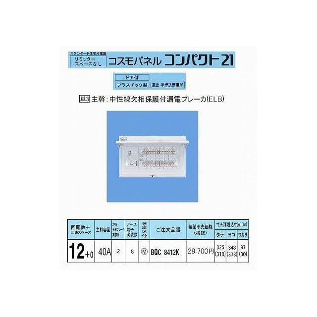 パナソニック(Panasonic) コスモパネル 住宅分電盤 標準タイプ リミッタースペース無 40A 12+0 BQR8412