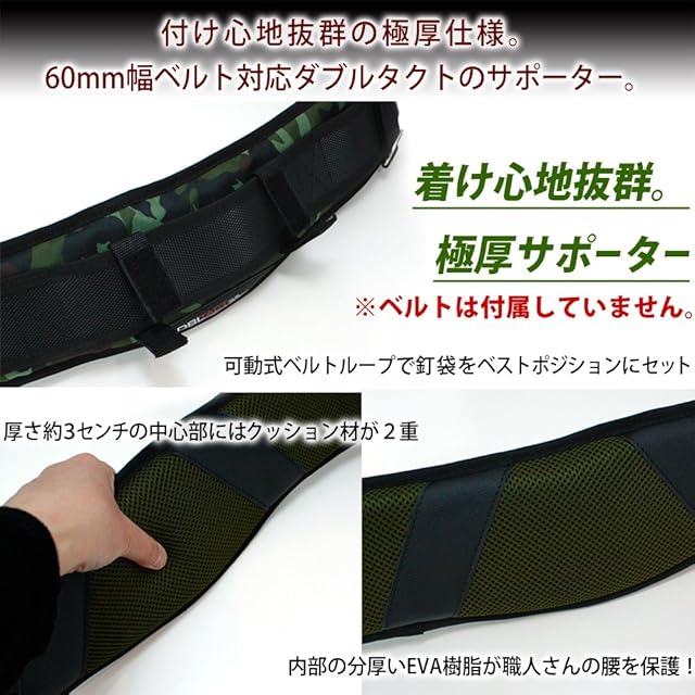 付け心地抜群の極厚サポーターは60mm幅ベルト対応。マジックテープの可動式ベルトループで好きな位置に腰袋をセットできます。
