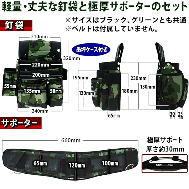タフ設計の使い心地と安心感。外布・内布、表裏からタフ素材を2重使いした釘袋は軽くて丈夫!かたくずれしにくく使いやすいです。墨坪ケース付き。透かし風の大人の迷彩ブラックと迷彩の定番グリーンの2種類です。