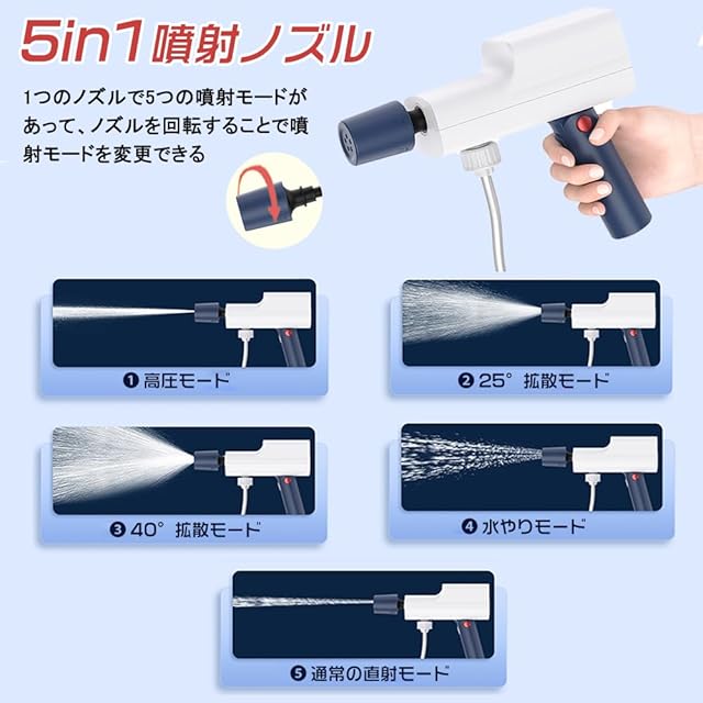 【多様なモード切り替え】車用洗浄機は5in1のノズルを備え、高圧モード、25°拡散モード、 40°拡散モード、水やりモード、通常の直射モードがあります。通常の散布などのモードを片手で簡単に切り替え可能。用途に応じて使い分けることができます。ノズルを回転させるだけで噴射モードが切替られます。用途や洗いたい場所、汚れの度合いなどに合わせてモードを選択可能です。