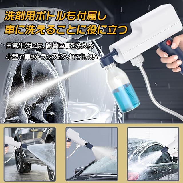 【様々なシーンで活躍】洗車だけではなく、ベランダや玄関周り、お風呂場の洗浄、庭の水やり、お墓掃除など様々なシーンで大活躍可能なポータブル高圧洗浄機です。日々の取り出し片付けも簡単なので毎日使え、家庭でもアウトドアでも快適な便利さを実現しました。注意:①付属のホースでは、水道の蛇口に直接接続することは不可です。バケツをご用意ください。②注意:ペットボトルは取り付けできません。