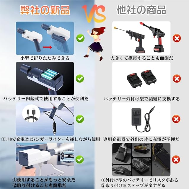 【更新ポイントがいっぱいある】2025年新登場のVIGOUROUSコードレス高圧洗浄機は折りたたみ式に進化しました。折り畳み式でコンパクトに収納可能で、携帯性に優れます。重量は1KGなので持ち運びや操作が容易で、女性や高齢者でもストレスなく使用できる。また、5m給水ホースを装備し、従来の水源の限界を打破し、簡単に給水することができます。さらにホースの先端には吸水フィルターがあり、水中の不純物を効果的にろ過せます。最後に、高圧洗浄機の中は4000mAh×3 の大容量バッテリーを内蔵し、(TYPE-C)USB充電式です。また、車の12Vシガーライターを挿しながら、使用できます。(給電できます。充電はできません)車でも簡単に充電できるため、外出先でも安心。家庭用の充電設備と併用して、充電の場所を選ばない。