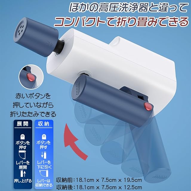 【折り畳める・コンパクト】この小型ハンディウォッシャーは折り畳めるので、収納時には場所を取りません折りたたみ前のサイズは18.1cm x 7.5cm x 19.5cm、折りたたみ後のサイズは18.1cm x 7.5cm x 12.5cm本体重量がわずか1.04kgくらいと軽量なので、片手でも使います。また、バッグなどに入れて、お気軽に持ち運び可能です。