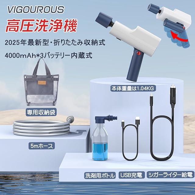 【在庫一掃・2025年・折りたたみ式・バッテリー内蔵】VIGOUROUS 高圧洗浄機 小型 洗車 折りたたみ式 USB充電式 12Vシガーライター給電 5in1ノズル ハンディウォッシャー 携帯便利 コードレス充電式 コンパクト 水道接続不要 ポータブル高圧洗浄機 洗剤用ボトル 5mホース付属 約1kg 4000mAh*3