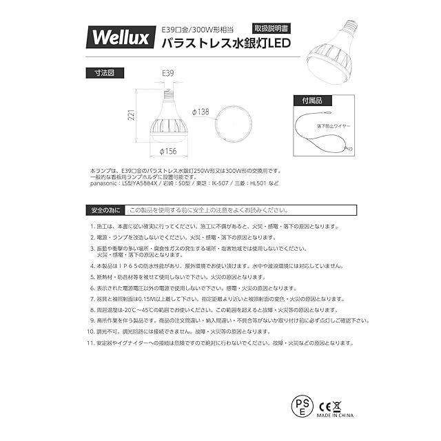 ✅E39口金・幅広い互換性:WelluxのバラストレスLEDランプは、E39口金のバラストレス水銀灯300W形の交換用です。一般的な看板用ランプホルダに設置可能です。【panasonic:LS型YA5884X / 岩崎:S0型 / 東芝:IK-507 / 三菱:HL501】など