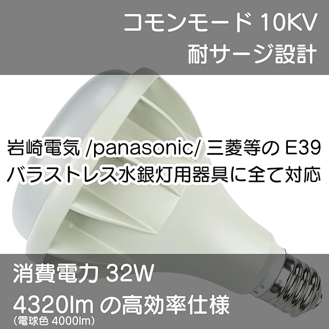 ✅高効率・省エネ:消費電力300Wの既存バラストレス水銀灯から、わずか消費電力32Wの高効率LEDランプへ簡単交換!全光束4000lmで、明るさをそのままに大幅な省エネを実現します。