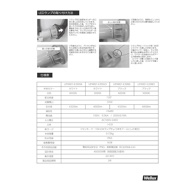 Wellux バラストレス水銀灯代替 LEDランプ 300W相当 E39口金 32W 防水IP65 屋外対応 電球色 ホワイト 落下防止ワイヤー付 看板照明 UPAR01-E39シリーズ