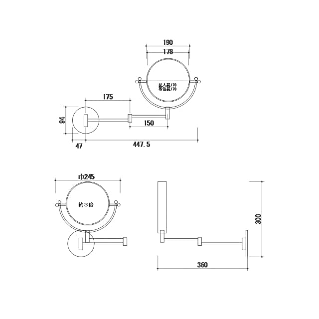 サイズ:高さ300×幅(最大時)500mm (直径:190/拡大鏡部分(約3倍強):178/奥行(最大)/360mm) 土台:(直径)95mm