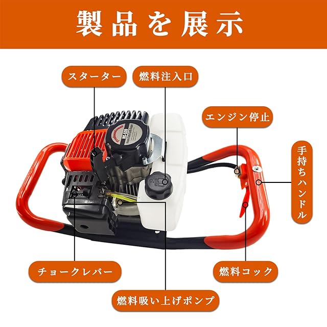 【製品詳細】商品名:エンジンオーガー。本体サイズ:51×28×35cm。本体重量:約8.3kg。排気量:52cc。出力:1900w(2.5馬力)。エンジンタイプ:空冷2サイクル。使用燃料:ガソリン&エンジンオイル(25:1)。燃料タンク容量:1200ml。