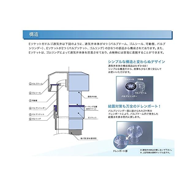 【シンプルな構造と変わらぬデザイン】通気弁本体の構成部分はわずか4点。シンプルな構造なので、長く安心してお使いいただけます。 ※Eソケット付ドルゴ通気弁は通気弁本体が4つ(バルブドーム、ゴムシール、可動盤、バルブシリンダー)、 Eソケットが2つ(バルブソケット、ゴムリング)の計6つの部品から構成されております。