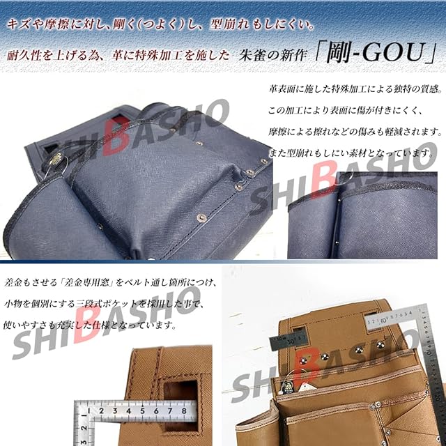 キズや摩擦に対し、剛く(つよく)し、型崩れもしにくい特殊加工を革表面に施しています。 これに由来し「剛-GOU」と名のついた丈夫な腰袋です。