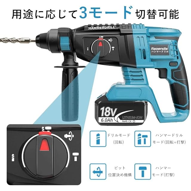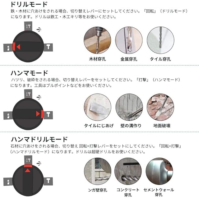 3つの作業モード搭載:ドリルモード:鉄や木材の穴あけ ハンマモード:ハツリ・破砕作業 ハンマドリルモード:石材の穴あけ(回転+打撃)
