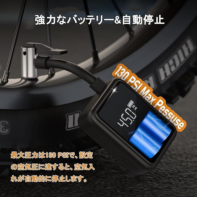 【プリセットモード&自動停止】電動空気入れの最大空気圧130PSIで、自動停止保護機能があります。3 つのプリセットモードがあり、希望のPSIを設定できます。プリセット値に達すると自動的に停止するため、安全に使用できます。
