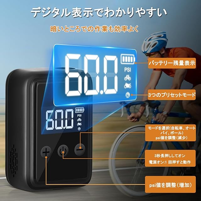 【米式/仏式バルブ】3種類のプリセットインフレーターモード(バイク、自転車、ボール)があり、初心者でも簡単に使用できます。米式/仏式バルブ付属しており、市販されているほぼすべての種類の自転車にユニバーサルであり、サイクリング愛好家のニーズを満たすことができます。オートバイ、ロードバイク、ボール、浮き輪までの空気入れこれ一台十分です。