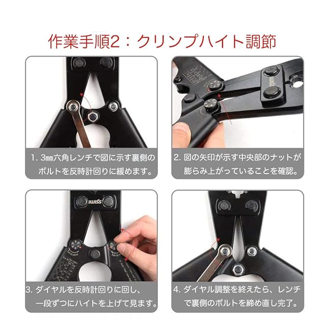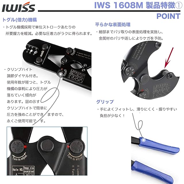 特徴:①トグル機構採用で単位ストロークあたりの所要握力を軽減。②クリンプハイト調節ダイヤルで経年劣化による圧着力低下を再修正が可能に
