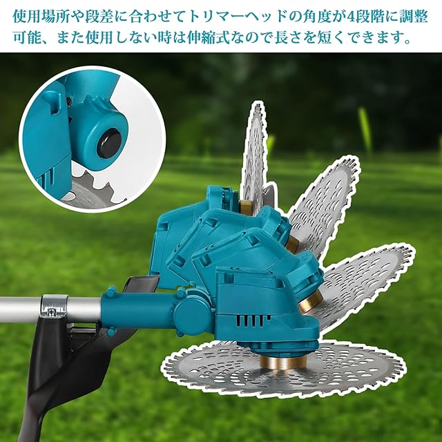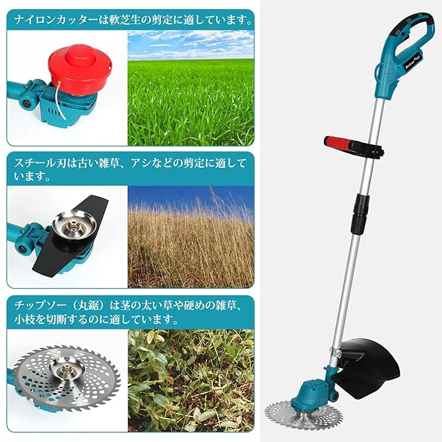 【3種類の替え刃・ループハンドル】 ナイロン刃、金属刃、チップソーの3種類の替え刃を用意していますので、 用途に合わせて適合な刃を交換できて様々なシーンで大活躍! ループハンドルは、上下を調節することができるため、 縦方向に動かしやすく、傾斜のある場所でも草刈りをおこなうことが可能です。