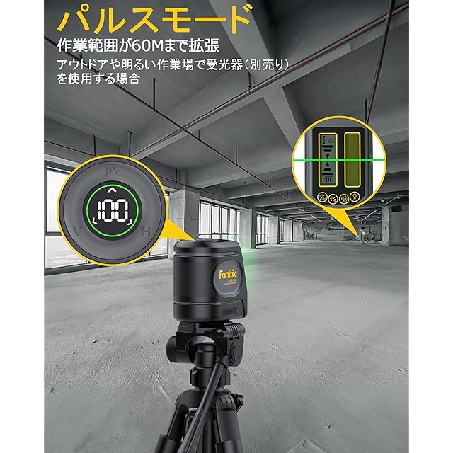 マルチレーザー組み合わせと操作モード: 当社のレーザーレベルは、特定の状況に応じて選択できる縦ライン、横ライン及び交差ラインの3つのラインレイアウトを提供します。パルスモードでは、受光器(別売)と一緒に屋外で使用でき、作業距離を60mまで延ばします。さらに、Fanttik D2 Pro レーザー墨出し器は自動水平補正モードと手動モードの両方を搭載しており、さまざまな使用場面に適しています。自動水平補正モードでは、レーザー墨出し器は最大3°の傾斜のある面で自動的に水平を合わせます