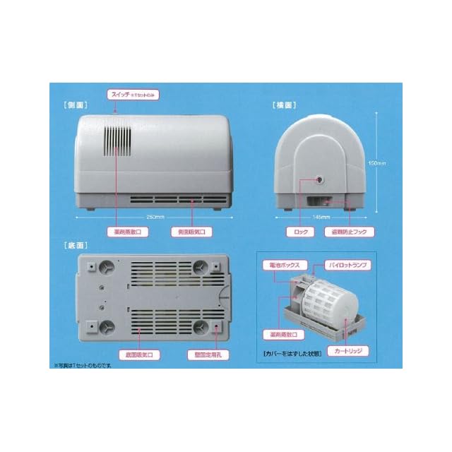 ●優れた害虫駆除効果により衛生活動管理を促進します。●電池式なのでコンセントのない場所でも設置することができます。●ニオイや煙が出ないため不快感を与えません。●新カートリッジ採用で効力1.8倍を実現しました。(当社従来品比較)●タイマーなしです。
