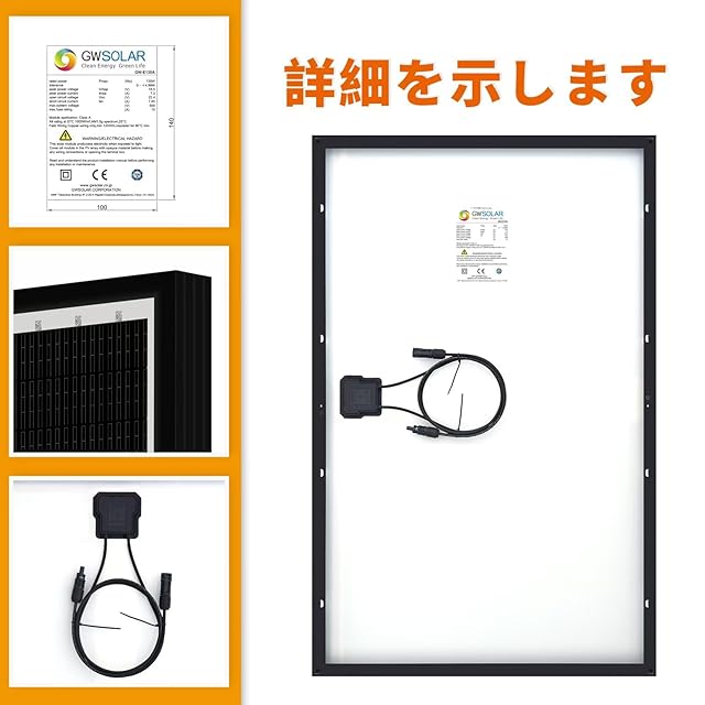 ★【仕様】 型番:GW-E135A 最大出力:135W ・ 最大出力動作電圧:18.5V ・最大出力動作電流:7.34A ・開放電圧:22.4V ・短絡電流:7.65A ・外形寸法:1039×665×35mm ケーブル長さ:1000mm(MC4コネクタ付 正極:凸型 負極:凹型)