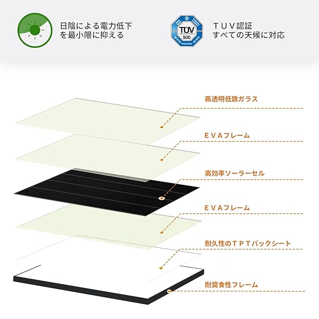 変換効率はJIS C 8918で規定するAM1.5、放射照度1000W/m²、モジュール温度25℃での値を使用し、JISC 8960 2012の計算式を用いて算出。(※JISC8960 2012:日本工業規格のページ9,309行・実行変換効率より出典) ・2017/9にJPEAの太陽光パネルリストに登録済。詳しくは再生可能エネルギー電子申請HPにて検索下さい。「自社調べ、2017年」