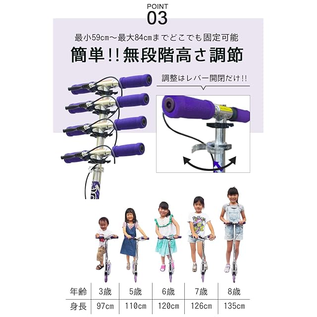 【高さはお好きな位置で固定可能】ハンドルの高さは段階的な調節ではなく、最小65cmから最大89cmまで子供の身長に合わせて自由な位置に簡単に固定できるので、一台あればみんなで遊べることができます。