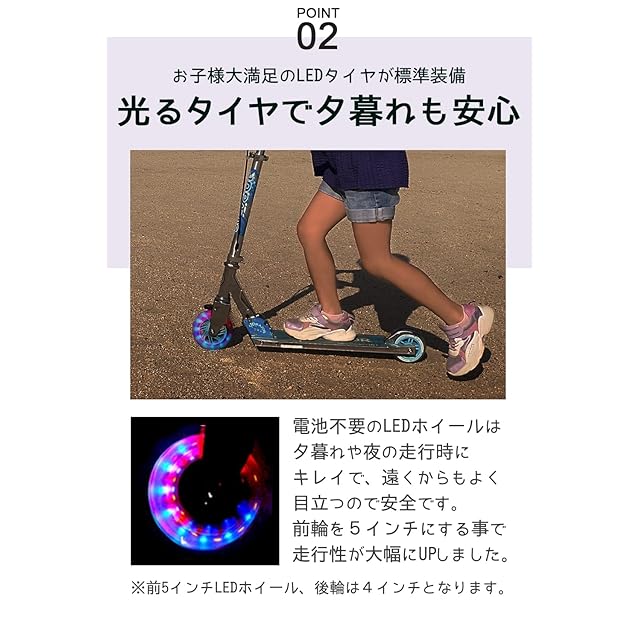 【走ると光るLEDタイヤで夕暮れ時も安心】前輪は走行性がUPした電池不要の5インチLEDホイールで、後輪はホイルカバーブレーキが踏みやすい4インチホイールを使用。耐摩耗性と耐荷重性に優れるポリウレタンを使用し滑らかに走ります