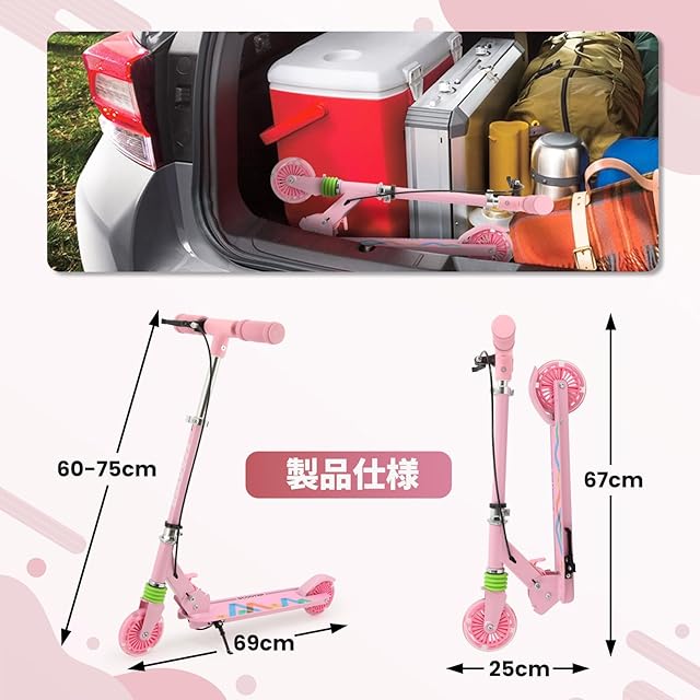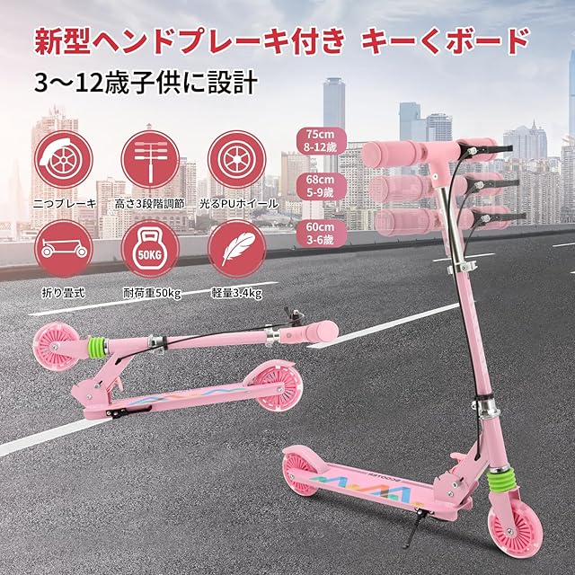 【高品質材料&3段階調節】この2輪スクーターは3歳~12歳のお子様向けに設計されています。耐久性のあり錆びにくいアルミニウム製で、70cm、75cm、80cmの3段階に調節でき、お子様一緒に成長せきるスクーターです。製品の耐荷重は50kgで、身長は90~155 cmのお子様にお勧めします。