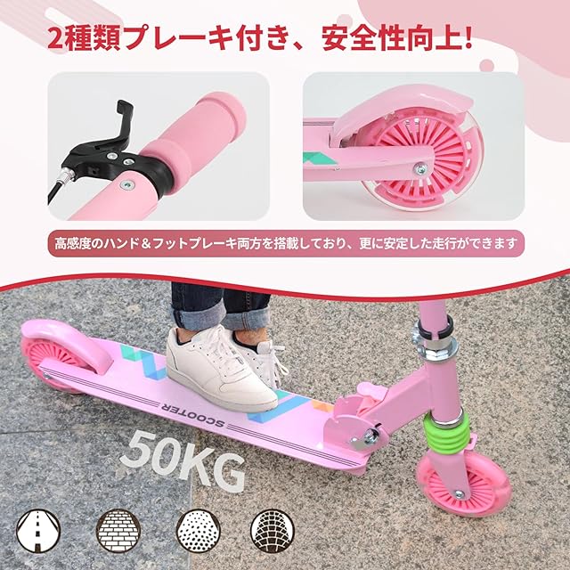 【新型ハンドブレーキ付き】ハンドブレーキ&フットブレーキ両方付きで、片足をブレーキにそっと置くことでいつでも停止できだけでなく、慣れた手のブレーキも整いました、安全性アップアップ!その上、幅広く滑り止めのデッキを採用し、ヤスリのようにざらざらなデッキで、スピードを出して走行しても滑りにくく、最大限度に安定性を実現できます。