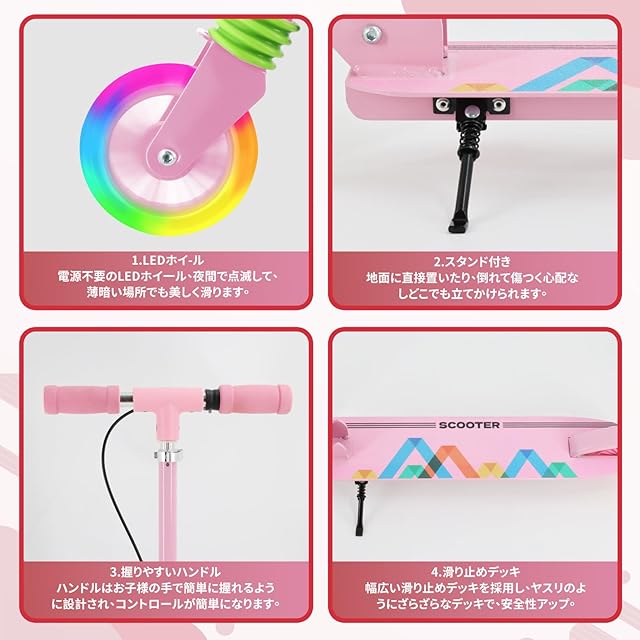 【PU製LEDホイール】LED点滅ホイール搭載、電池は必要ありません。車輪の素材は耐摩耗性に優れる高反発PUを採用し、走行中の音は小さく、振動感も少ない滑らかな走りです。少々のガタガタ道、凸凹道、砂利石で走行してもスムーズに走れます。乗り心地が抜群です。